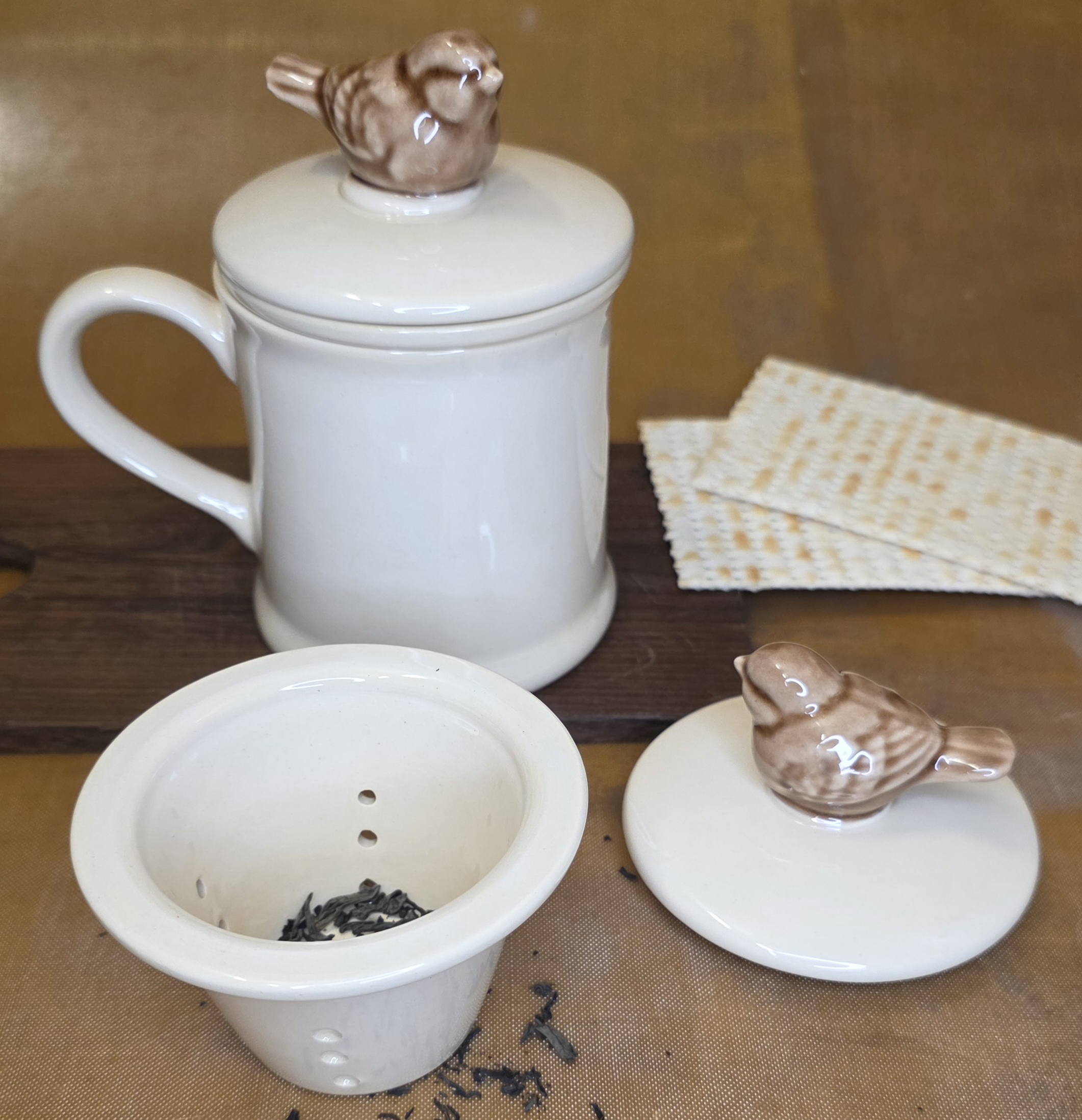 Keramikinis akmens masės puodelis kartu su sieteliu ir dangteliu puikiai tiks visiems kas mėgsta gerti arbatą.